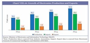 The Economic Survey mentions that against a backdrop of global trade uncertainty, India’s total exports (merchandise and services) reached a record USD 825.3 billion in FY25, with continued momentum in FY26. Despite heightened tariffs imposed by the United States, merchandise exports grew by 2.4 per cent (April–December 2025), while services exports increased by 6.5 per cent. Merchandise imports for April-December 2025 increased by 5.9 per cent. Following the trends in previous years, the rise in merchandise trade deficit has been counterbalanced by an increase in services trade surplus, while the growth in remittances has bolstered this balance. In most years, remittances have surpassed gross FDI inflows, underscoring their importance as a key source of external funding. As a result, the current account deficit remains moderate at 0.8 per cent of GDP in H1 FY26.